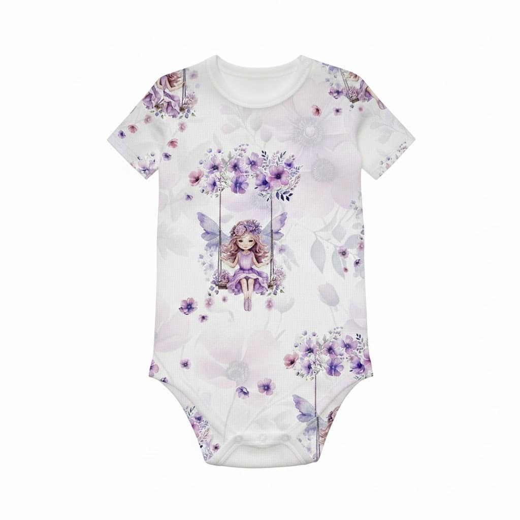 Baba body lila tündér mintával, 44–146 méretig, kislányok számára. Puha és kényelmes anyagból készült, ideális mindennapi viselethez, játékhoz és alváshoz.