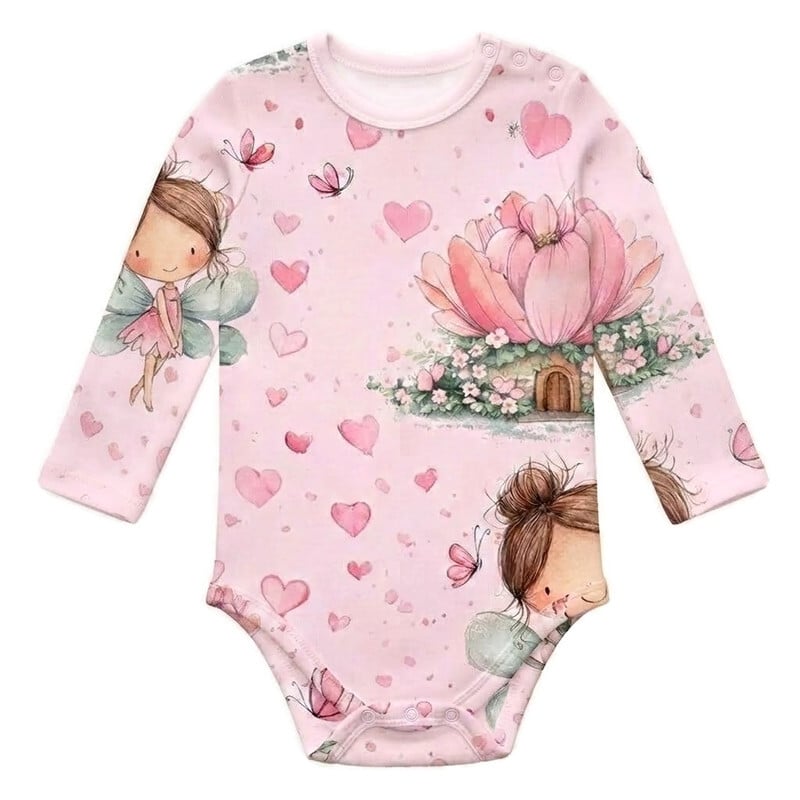 Ez a baba body aranyos rózsaszín színben készült, tündéres mintával.