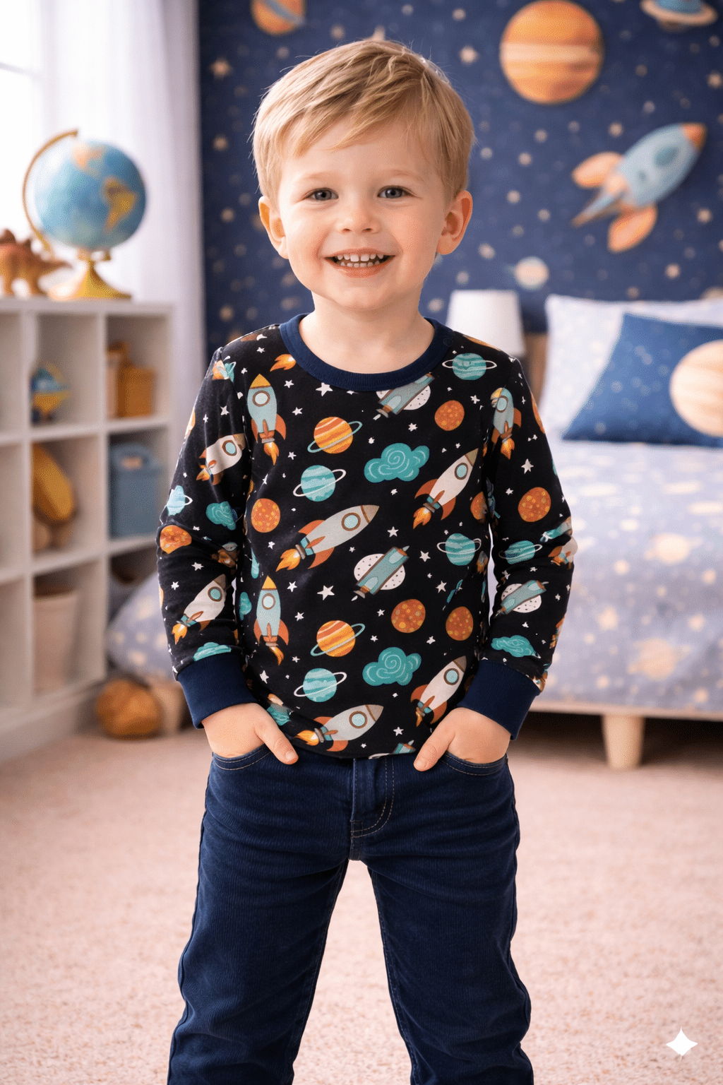 Vidám és figyelemfelkeltő űrhajós minta, amely egyedi stílust ad minden kis felfedezőnek. Ideális mindennapi viseletre, játékhoz vagy óvodába.