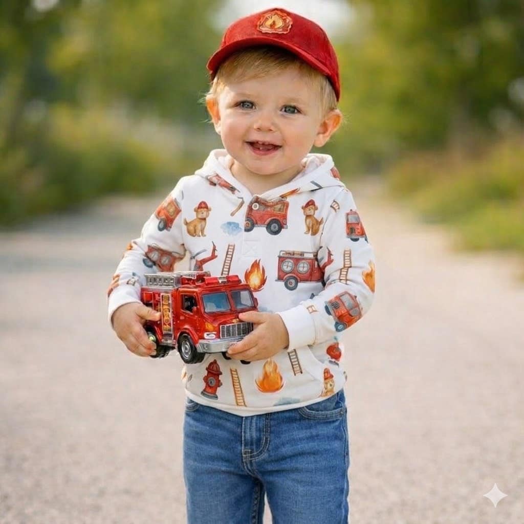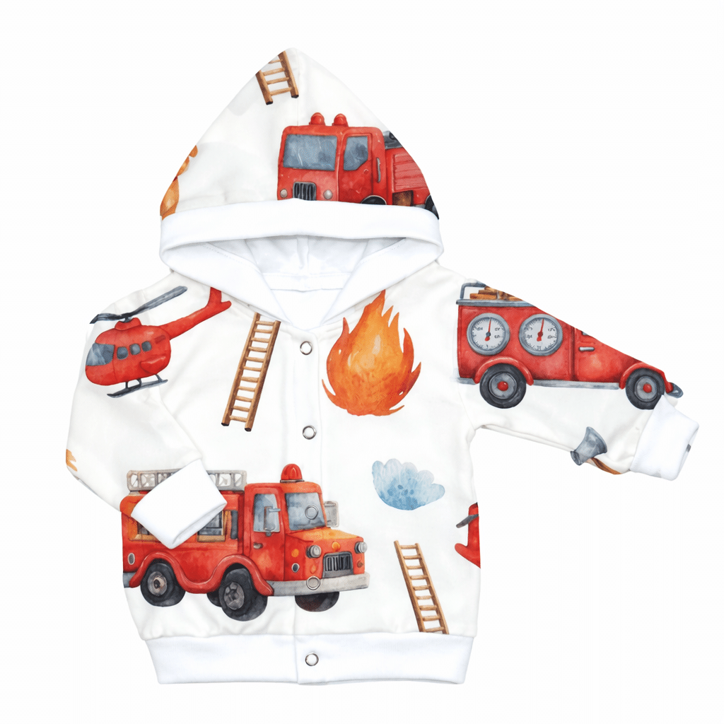 Kényelmes baba kardigán tűzoltó autó mintával, amely ideális hűvösebb napokra.