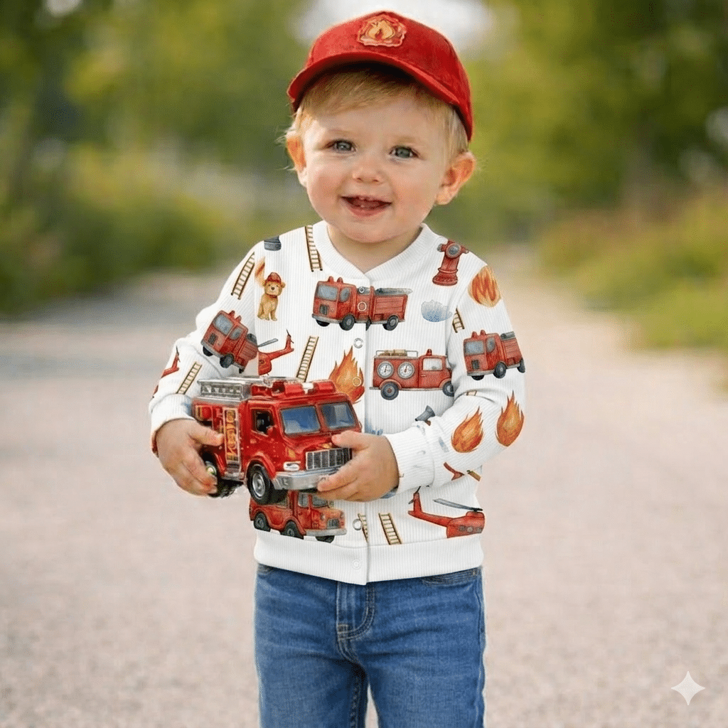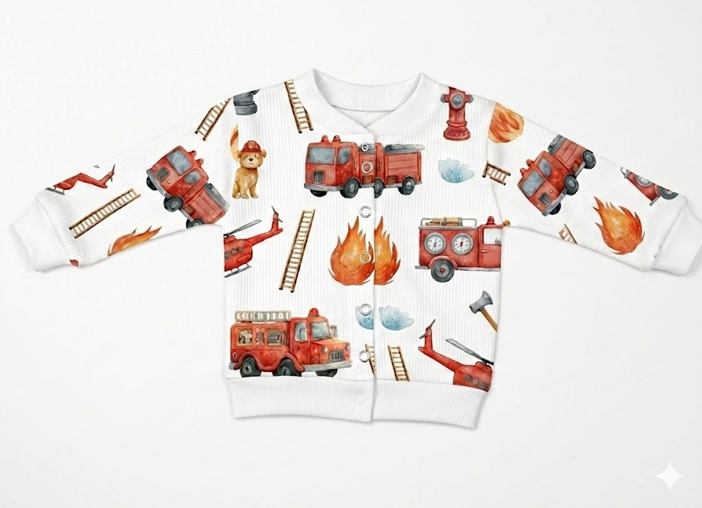 Kényelmes baba kardigán tűzoltó autós mintával, amely ideális hűvösebb napokra.