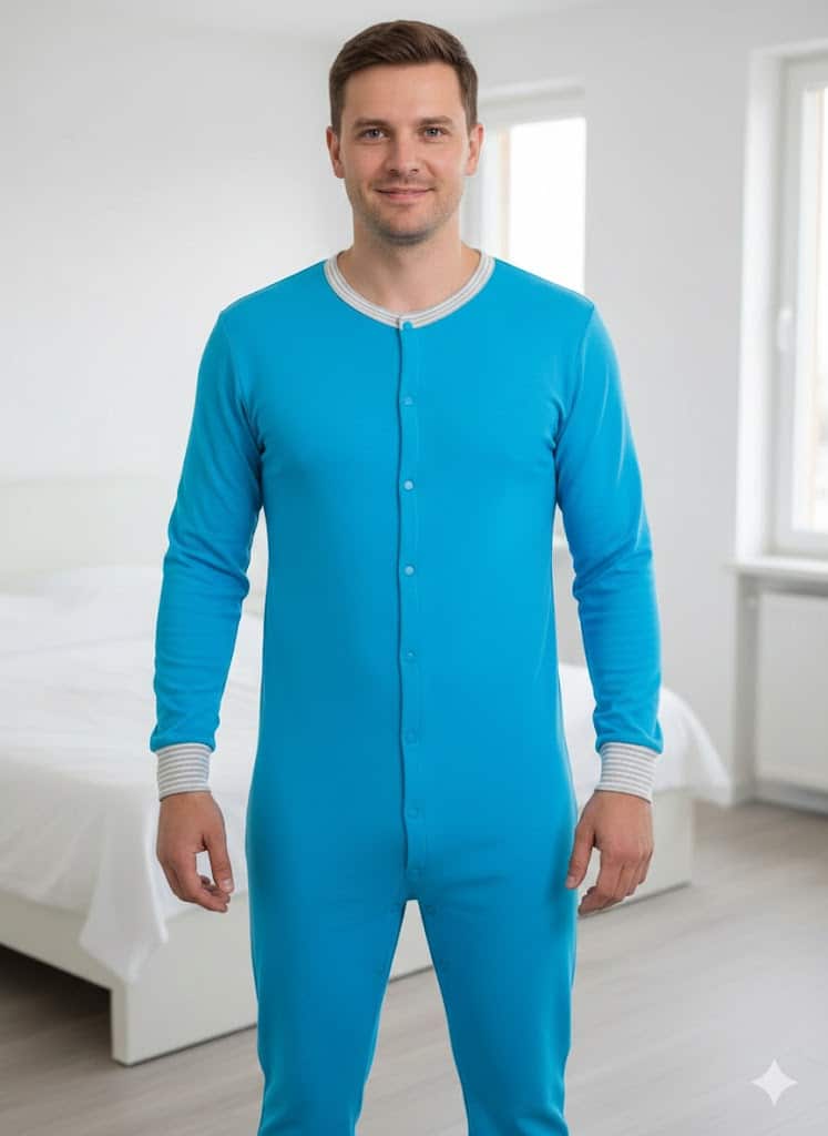 Ez a férfi kezeslábas a kényelmet és praktikusságot helyezi előtérbe, kifejezetten ABDL és halmozottan sérült felnőttek számára.