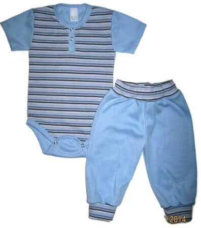Termék anyaga: Magyar pamut. Összetétele: 70 % pamut+ 30 % poliészter. Gyerek body szettek fiús színe: farmerkék-fehér-sötétkék keskeny csíkos body rövid ujjú, világoskék nadrággal, csíkos szegőkkel. A ruhák nikkelmentes patenttal vannak ellátva, ami kizárja az irritációt. Szívesen ajánljuk a termékhez színben illő, más kategóriában lévő termékeinket.