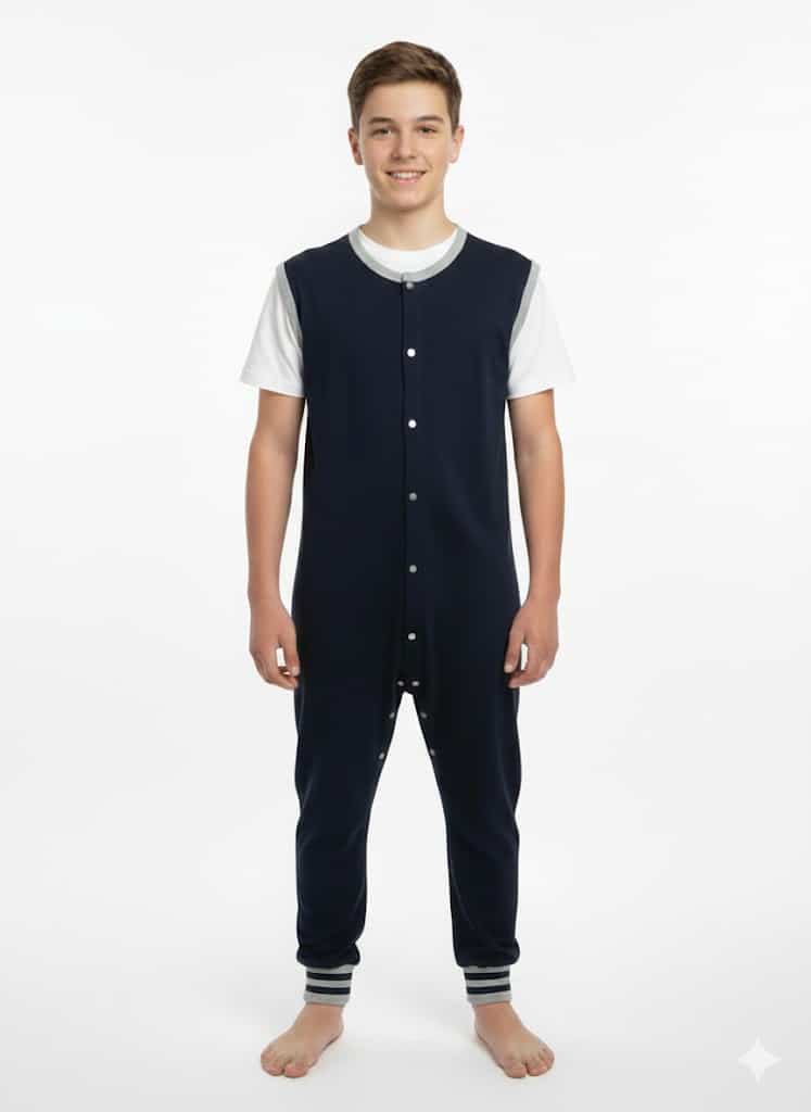 Kényelmes kamasz fiú kezeslábas, puha és rugalmas anyagból, ideális mindennapi használatra, otthoni pihenésre és szabadidős tevékenységekre. Szabad mozgást biztosít, praktikus viselet, könnyen fel- és levehető.