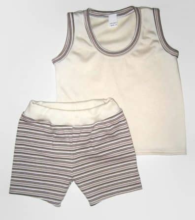 Termék anyaga: Magyar pamut. Összetétele: 70 % pamut+ 30 % poliészter. Ujjatlan szett fiúknak színe: vajszínű ujjatlan póló, drapp-barna-fehér csíkos szegőkkel és színben hozzá illő csíkos rövid nadrág, gumis derékkal. Szívesen ajánljuk a termékhez színben illő, más kategóriában lévő termékeinket.