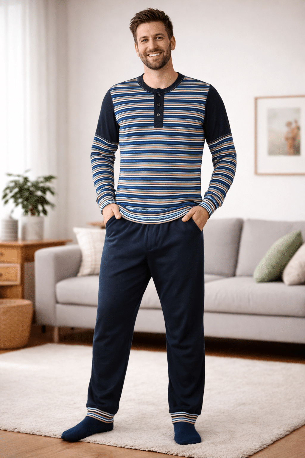 Felnőtt férfi szettjeinket úgy válogattuk össze, hogy a felsőrész és az alsóruházat stílusban és funkcióban is tökéletesen kiegészítse egymást. A pamut anyag biztosítja a bőr természetes szellőzését és az egész napos puhaságot. A nadrágok és felsők szabása bőséges helyet hagy a pelenka számára, így az minden helyzetben észrevétlen marad.